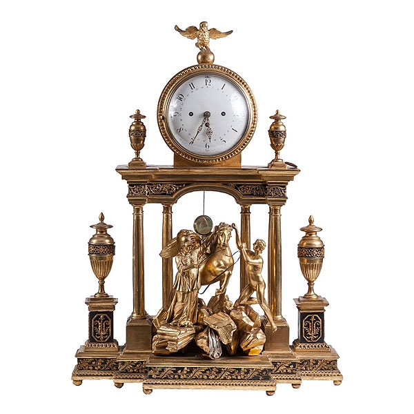Reloj Neoclásico de madera tallada y dorada en forma de pórtico arquitectónico con figuras de bulto, trabajo austriaco de ffs.S.XVIII - pps-S.XIX