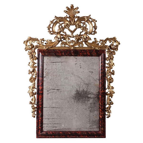 Espejo con copete de madera tallada y dorada y moldura policromada imitando carey de estilo barroco