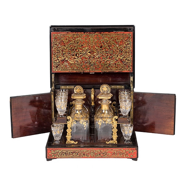 Caja licorera francesa de marquetería "Boulle" con copas y garrafillas de cristal tallado, Napoleón III, S.XIX.