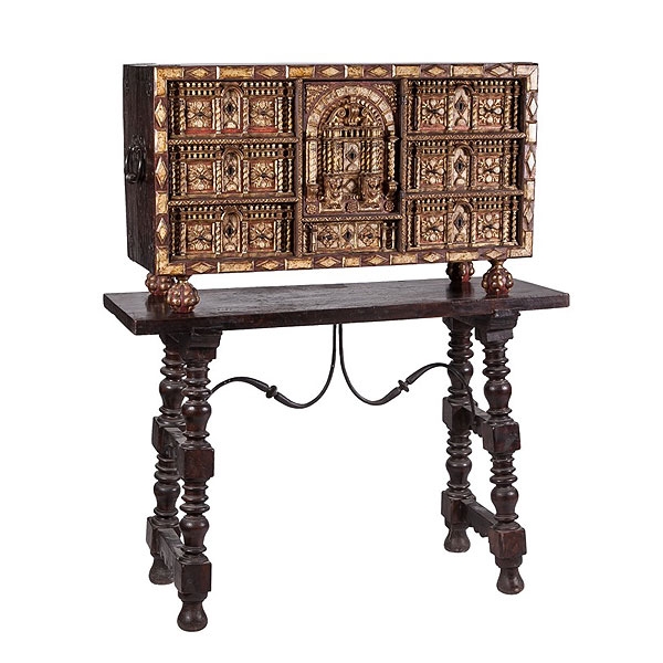 Bargueño de nogal con frente tallado, dorado y con embutidos y columnillas de hueso