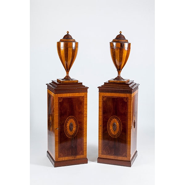 Pareja de urnas para cubiertos de madera de caoba y limoncillo sobre pedestales con puertas