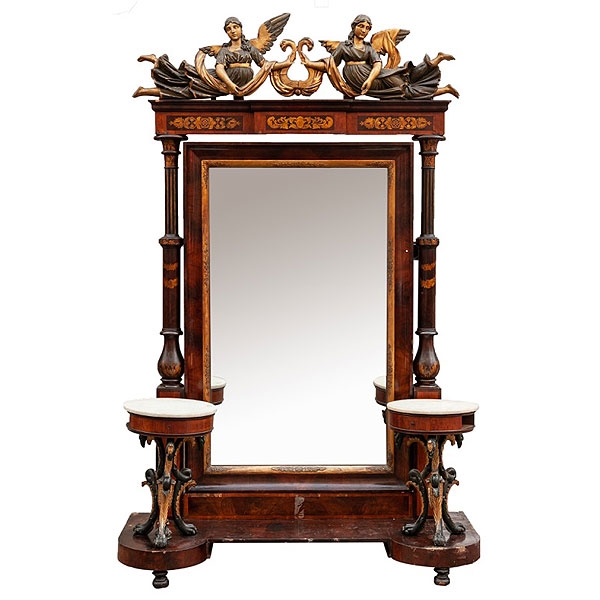 Gran espejo de caoba y palma de caoba parcialmente dorada época Imperio, S.XIX.
