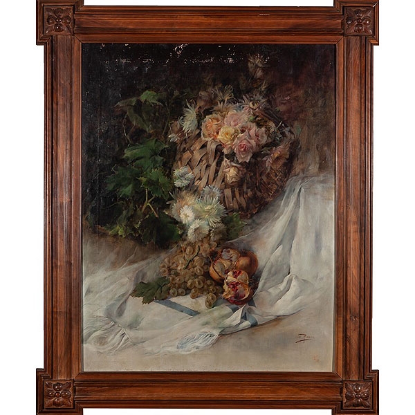 "Bodegón con cesto de rosas, uvas y granadas"