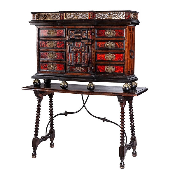 Bargueño español sobre mesa de madera ebonizada, carey y aplicaciones de bronce, época Carlos II, ffs.S. XVII. Capilla central arquitectónica