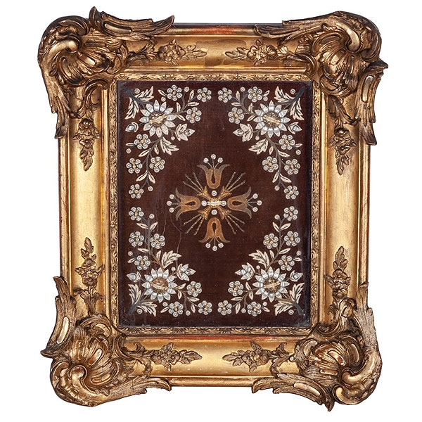 Relicario francés bordado con marco tallado y dorado, trabajo conventual del S.XIX,