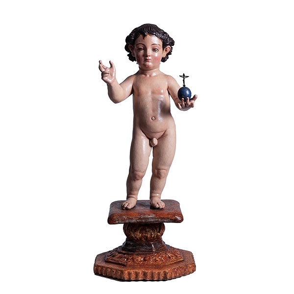 Niño Jesús de madera tallada y policromada con ojos de pasta vítrea, sobre peana con restos de dorado S.XVIII
