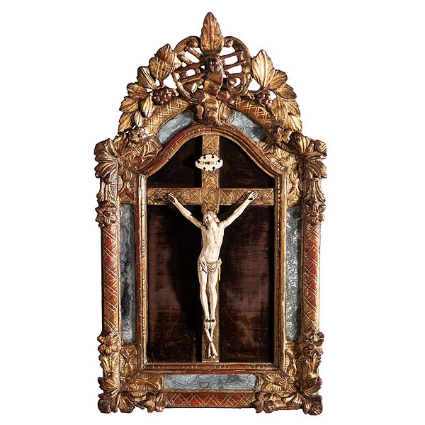 Cristo de marfil tallado en marco tallado y dorado, trabajo francés de ffs.S.XVII - pps.S.XVIII