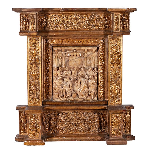 Relieve de alabastro "Santa Cena", trabajo de Malinas S.XVI. Con marco tallado y dorado