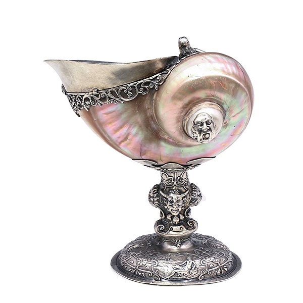 Nautilus montado en plata con decoración de grutescos y cueros recortados con marcas de Palencia Paredes y Domingo Medina S. XVI-XVII. Pieza probablemente centroeuropea punzonada en españa.