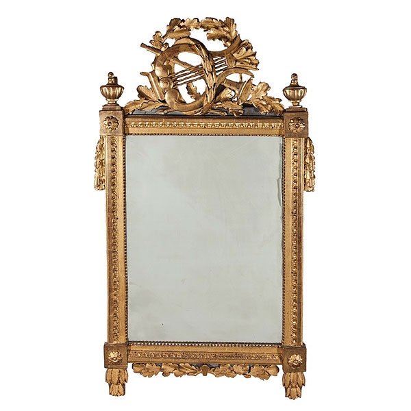 Espejo francés de madera tallada y policromada rematado por trofeo musical con lira, época Luis XVI, S.XVIII
