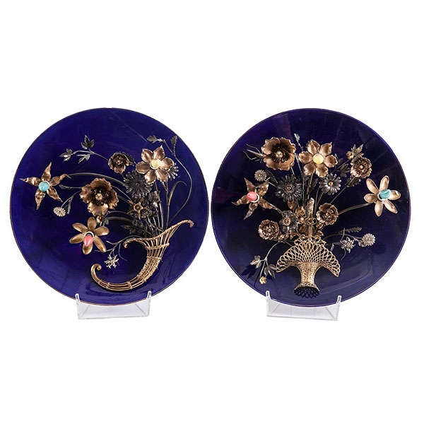 Pareja de platos de loza azul con apliques de metal dorado, pps.S.XX.