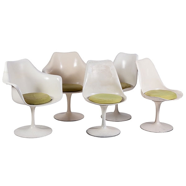 Tres sillas y dos sillas de brazos de plastico modelo Tulip.