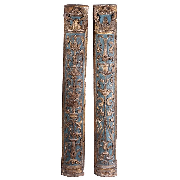 Pareja de medias columnas de madera tallada, policromada y dorada con decoraciones "a candelieri", Castilla primera mitad del S.XVI