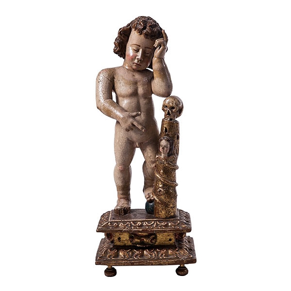 Niño Jesús de pasión de madera tallada, policromada y dorada, trabajo colonial principios del S.XVIII
