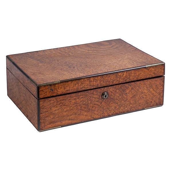 Caja tocador de viaje inglesa de madera de raíz con tarros y cajas de plata S.XIX