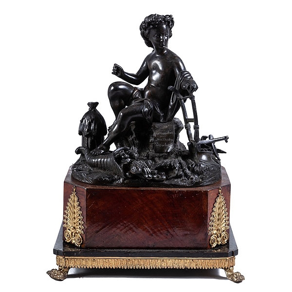 Figura alegórica francesa de bronce patinado sobre base de madera de caoba y latón dorado, S.XIX