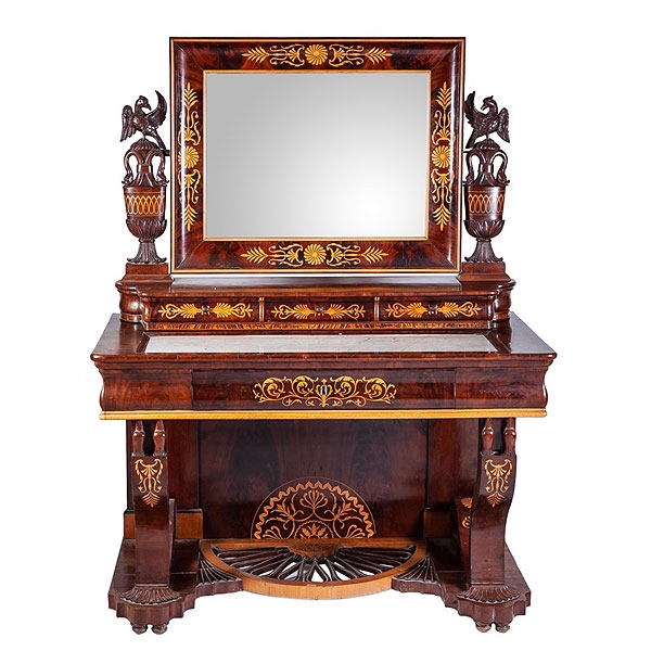 Tocador español de época fernandina de caoba con marquetería de limoncillo S.XIX. Con escritorio en el cajón frontal