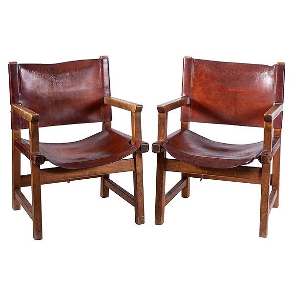Francisco Muñoz Cabrero (ESTUDIO DARRO), Pareja de butacas de nogal con asiento y respaldo de cuero cosido a mano, Modelo "Riaza" diseño de 1958