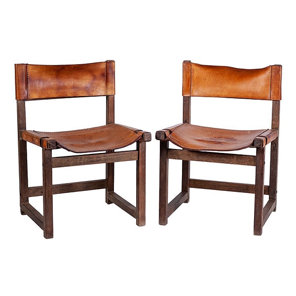 Francisco Muñoz Cabrero (ESTUDIO DARRO), Pareja de sillas de nogal con asiento y respaldo de cuero cosido a mano, Modelo "Riaza" diseño de 1958