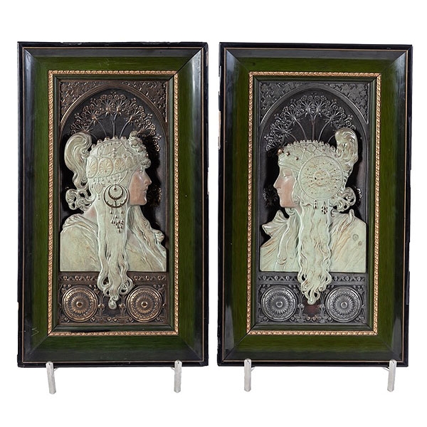 Atribuido a Alfons Mucha (Moravia, 1860 - Praga, 1939). Pareja de relieves de bronce y latón patinado con damas de perfil en el gusto de Mucha, trabajo centroeuropeo c.1900