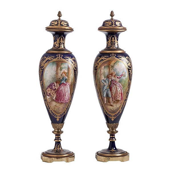 Pareja de jarrones con tapa de loza esmaltada de Sévres y aplicaciones de bronce de fondo azul y realces dorados con cartelas de escenas galantes firmadas "J. Perrot" c.1900.