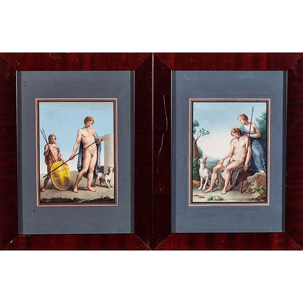Pareja de grabados coloreados
