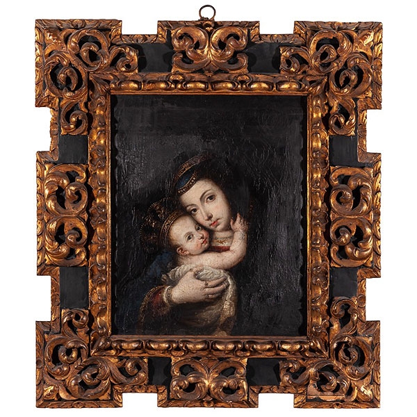 Con importante marco tallado, policromado y dorado de época