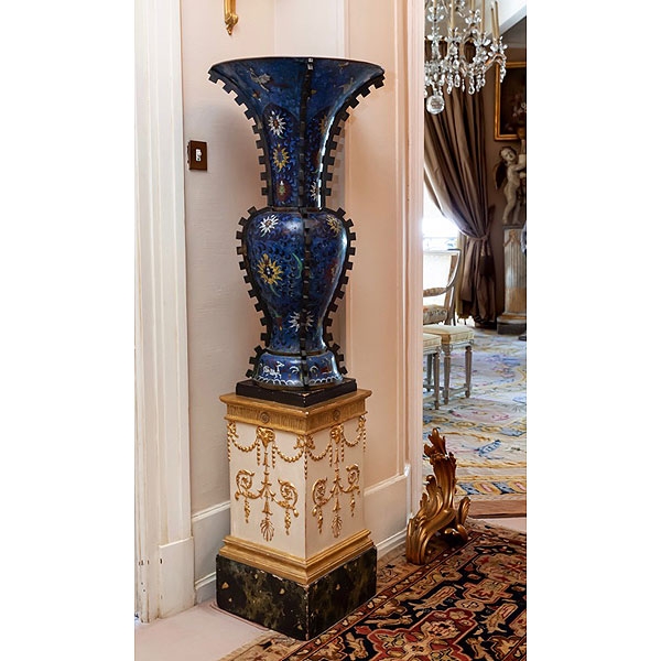Pareja de grandes jarrones chinos de bronce con decoración de esmalte cloisoné con decoración de peonías y caballos sobre fondo azul, periodo Quianlong, S.XVIII - XIX