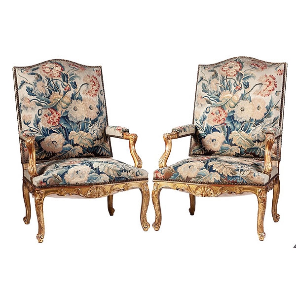 Pareja de butacas francesas con respaldo "a la reina" de madera tallada y dorada con tapicería de punto de tapiz, estilo Regencia, S.XIX.