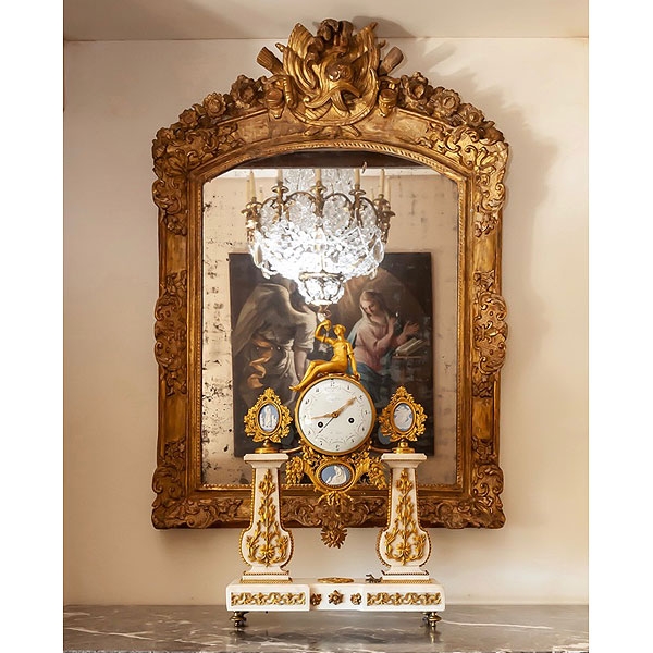 Reloj de sobremesa francés de mármol blanco y bronce dorado con placas de biscuit en el gusto de Wedgwood, época Luis XVI, S.XVIII. Esfera firmada "Baillots"
