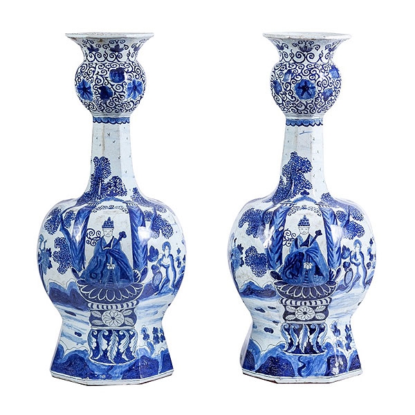Pareja de jarrones de cerámica esmaltada de Delft con decoración en azul y rojo de gusto oriental, S.XVIII