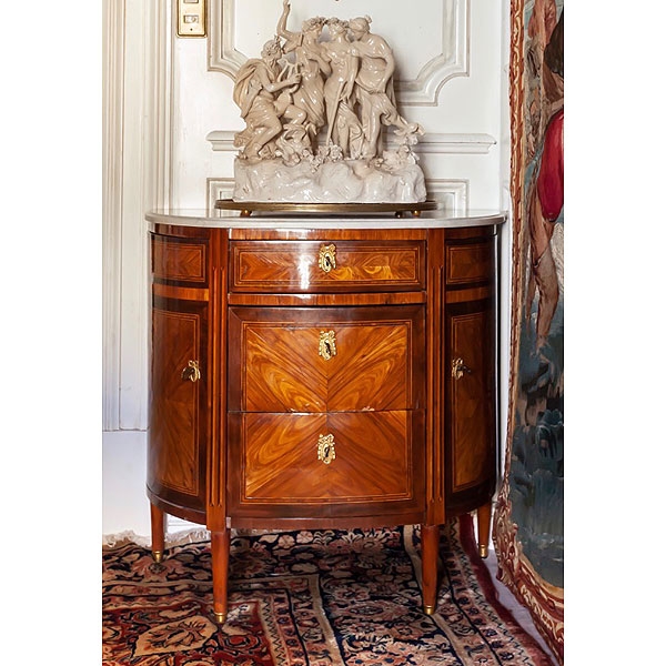 Cómoda de "media luna" francesa con decoración de marquetería formando plumeados en alas de mariposa y tapa de mármol, época Luis XVI, ffs.S.XVIII