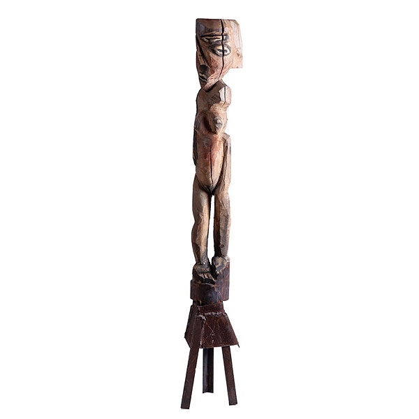 Escultura en madera tallada y policromada sobre base de acero corten.