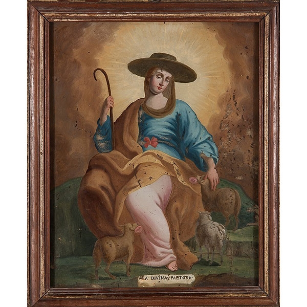 Vidrio pintado al óleo por el reverso "La Divina Pastora" trabajo español del S.XVIII