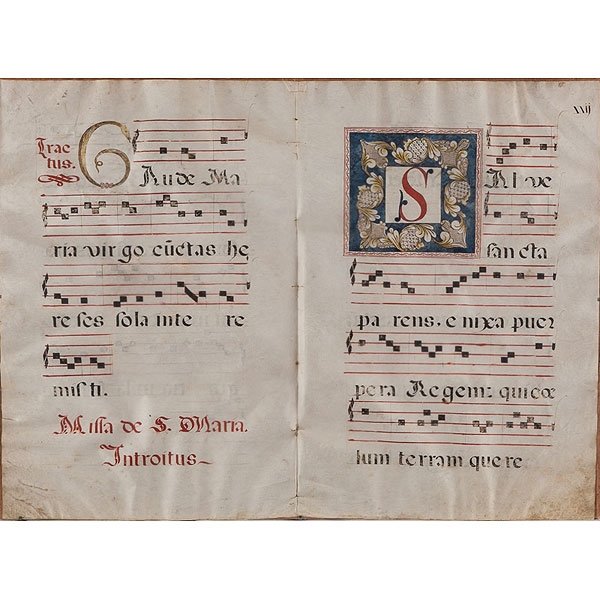 Tres páginas de pergamino iluminadas de cantoral S.XVII