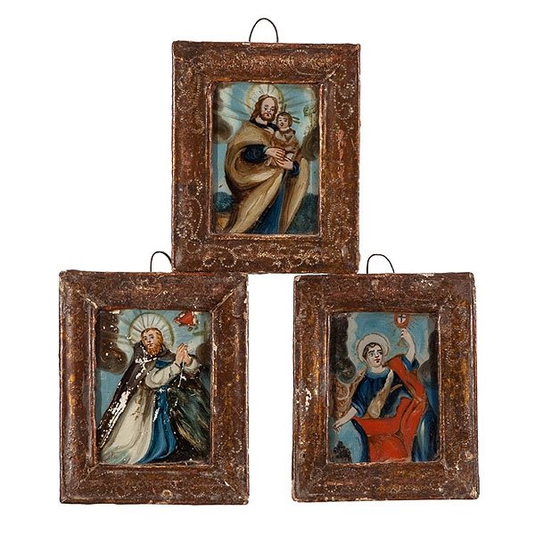 Tres vidrios pintados por el reverso con imágenes de santos y marcos dorados S.XVIII