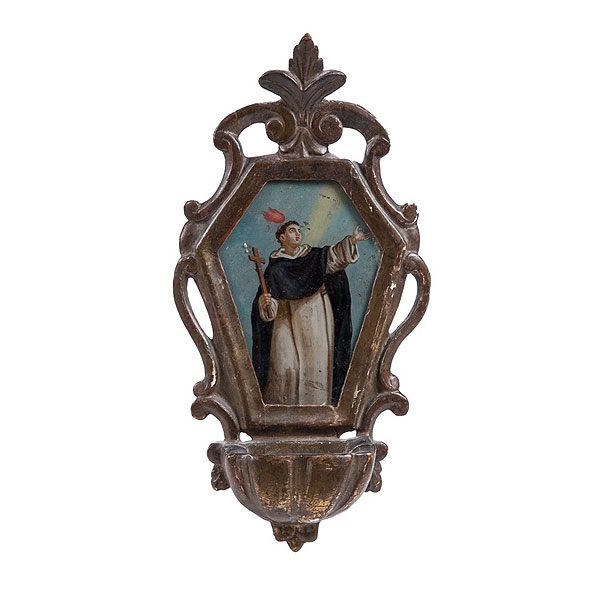 Benditera de madera tallada y corlada con vidrio pintado por el reverso "Santo Domingo" ffs.S.XVIII