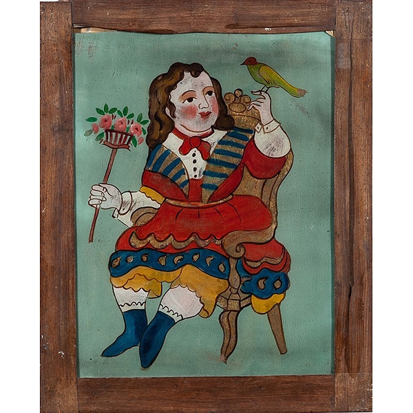 Vidrio pintado y dorado por el reverso "Niño con pajarito" S.XIX