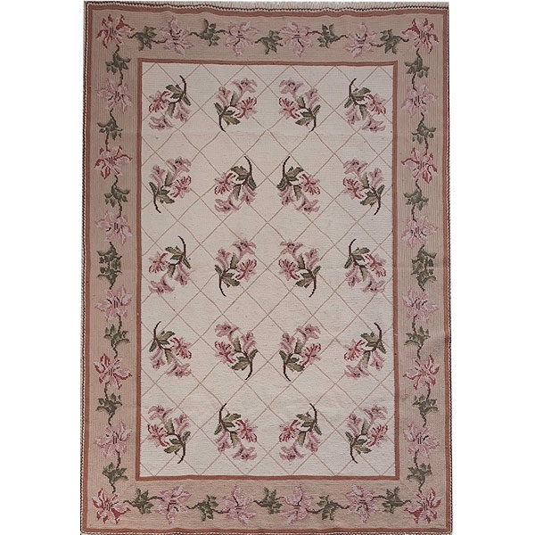 Alfombra de lana tipo Arrayolos de campo claro y decoración floral en rombos