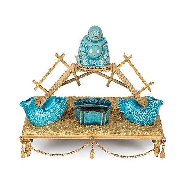 Escribanía francesa de bronce dorado con recipientes y figura de Buda de porcelana china azul turquesa S.XIX