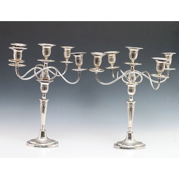 Pareja de candelabros ingleses de cinco luces convertibles en candelero de metal plateado según modelos neoclásicos, pps.S.XX. Faltas en un vástago