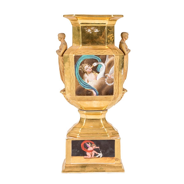 Jarrón de porcelana francesa Viejo París con fondo dorado y decoración en cartelas, S.XIX