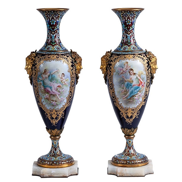 Pareja de jarrones franceses de porcelana a la manera de Sèvres con monturas de bronce con esmalte cloisonné y bases de ónix, Época Napoleón III, S.XIX