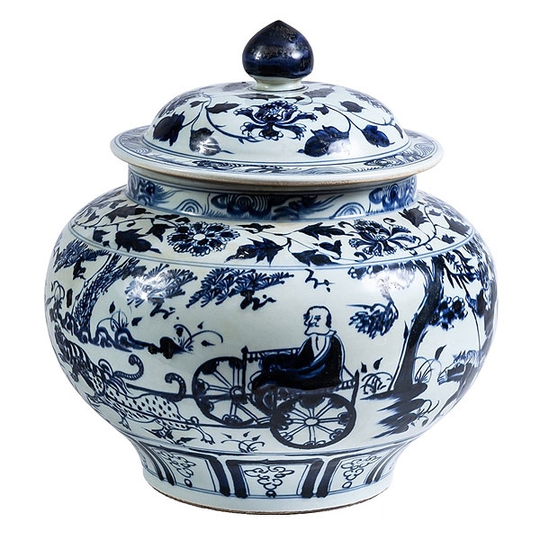 Tibor con tapa de cerámica China azul y blanco con escenas cortesanas, marcas apócrifas y sello en la base. S.XIX