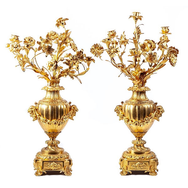 Pareja de candelabros de seis luces de bronce dorado en forma de jarrones con flores, época Napoléon III, S.XIX