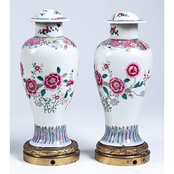 Pareja de bases de lámpara con tibores chinos "Familia rosa" y monturas de bronce estilo Luis XVI