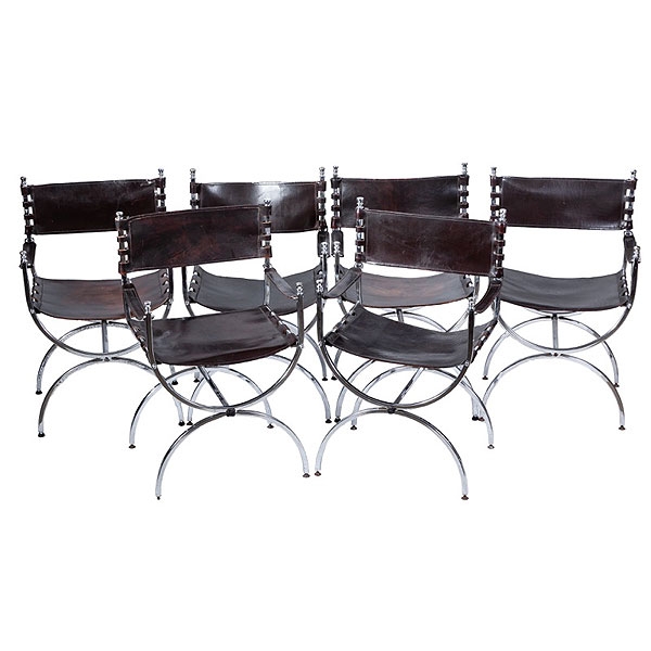 Seis sillas de brazos cromadas con asiento y respaldo de cuero, trabajo francés diseño del S.XX