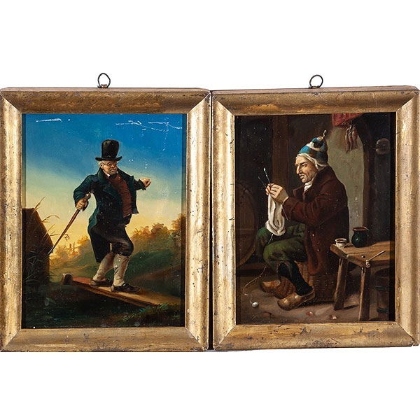 Dos óleos sobre metal "Escenas costumbristas" con marcos dorados, S.XIX