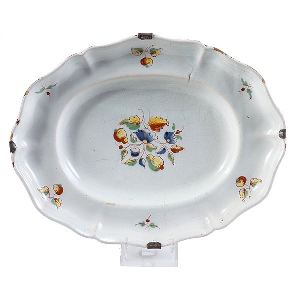 Fuente oval de borde ingletado de cerámica con decoración policroma S.XVIII