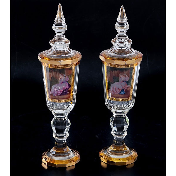 Pareja de copas con tapa de cristal tallado y dorado pps.S.XIX. Una rota